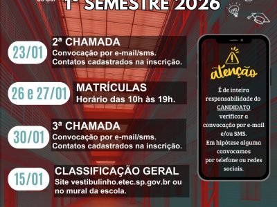 Já estão disponíveis as listas de convocação da 2ª chamada do Vestibulinho 2026. As matrículas deverão ser realizadas nos dias 26 e 27 de janeiro de 2026 LISTAS: MÉDIO – ADMINISTRAÇÃO – 2ª CHAMADA GERALMÉDIO […]