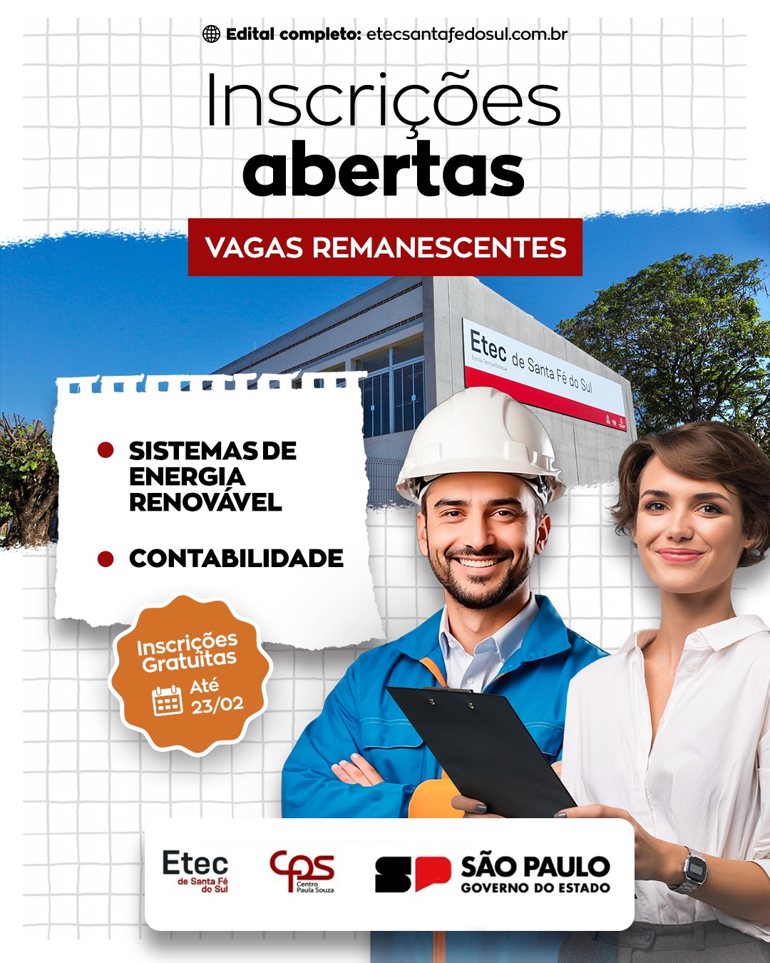 Estão abertas as inscrições para o Processo Seletivo de vagas remanescentes do 1º módulo dos cursos técnicos modulares em Técnico em Contabilidade e Técnico em Sistemas de Energia Renovável. Os interessados deverão realizar a inscrição […]
