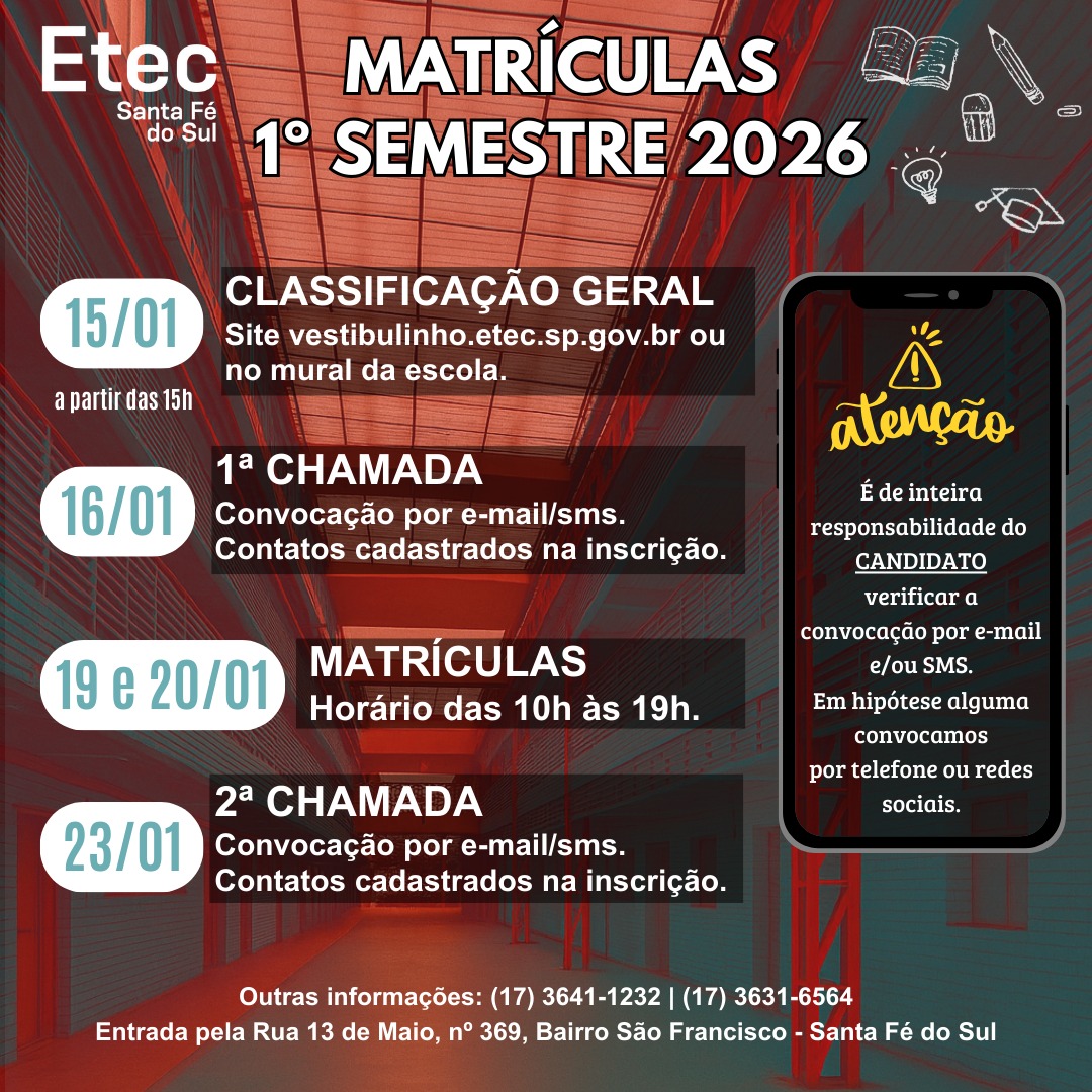 Já estão disponíveis as listas de convocação da 1ª chamada do Vestibulinho 2026. As matrículas deverão ser realizadas nos dias 19 e 20 de janeiro de 2026 LISTAS: MÉDIO – ADMINISTRAÇÃO – 1ª CHAMADA GERALMÉDIO […]