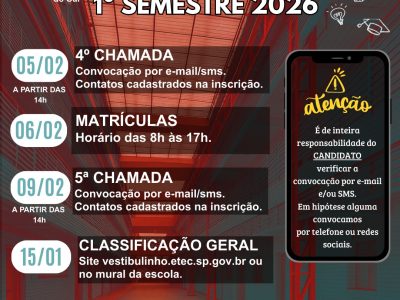 Já estão disponíveis as listas de convocação da quarta chamada para matrículas na ETEC de Santa Fé do Sul. Atenção: o candidato que não realizar a matrícula dentro do prazo poderá perder a vaga. Para […]