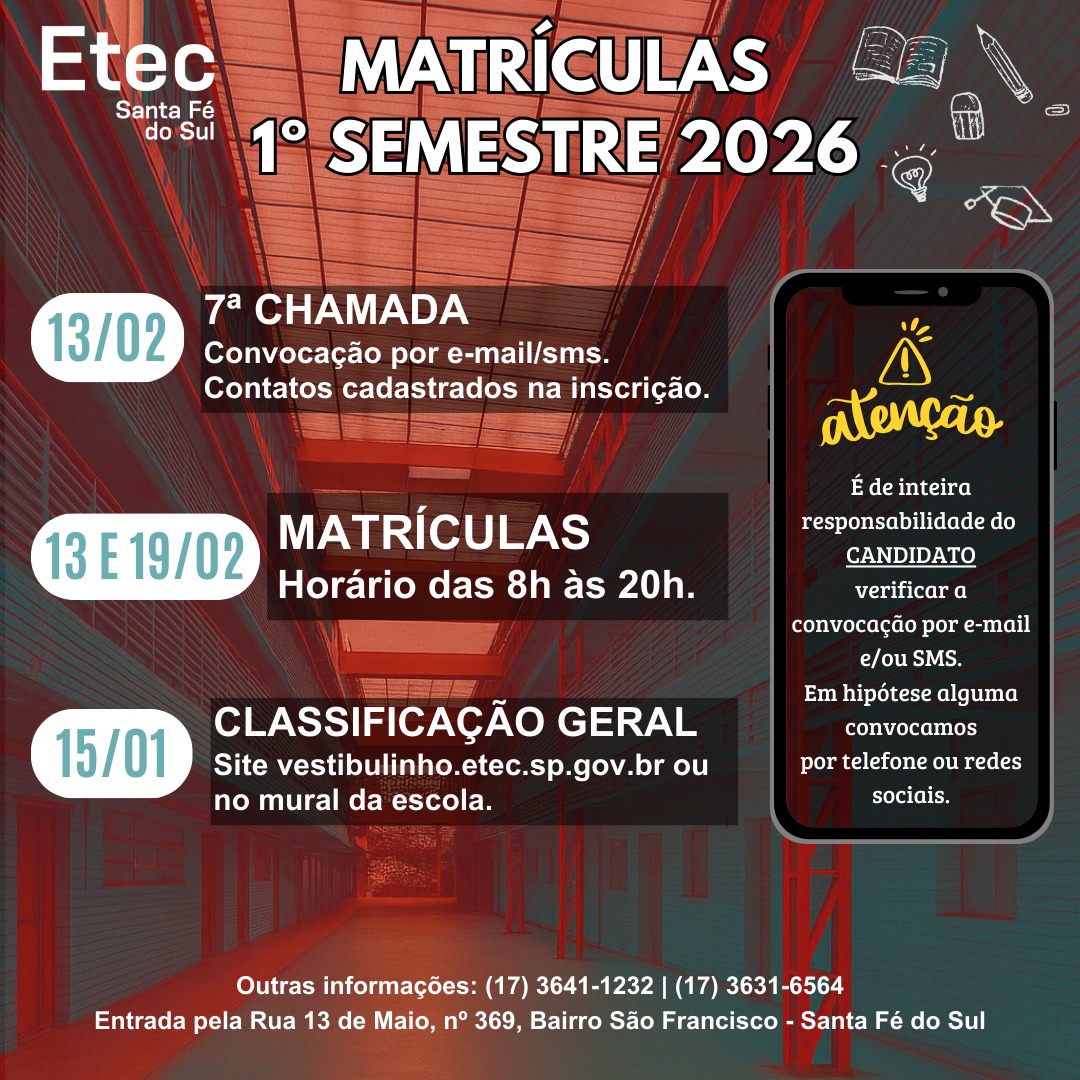 Já estão disponíveis as listas de convocação da 7ª chamada do Vestibulinho 2026. As matrículas deverão ser realizadas no dia 13/02 e 19/02 LISTAS: MÉDIO – ADMINISTRAÇÃO – 7ª CHAMADA GERALMÉDIO – RECURSOS HUMANOS – […]