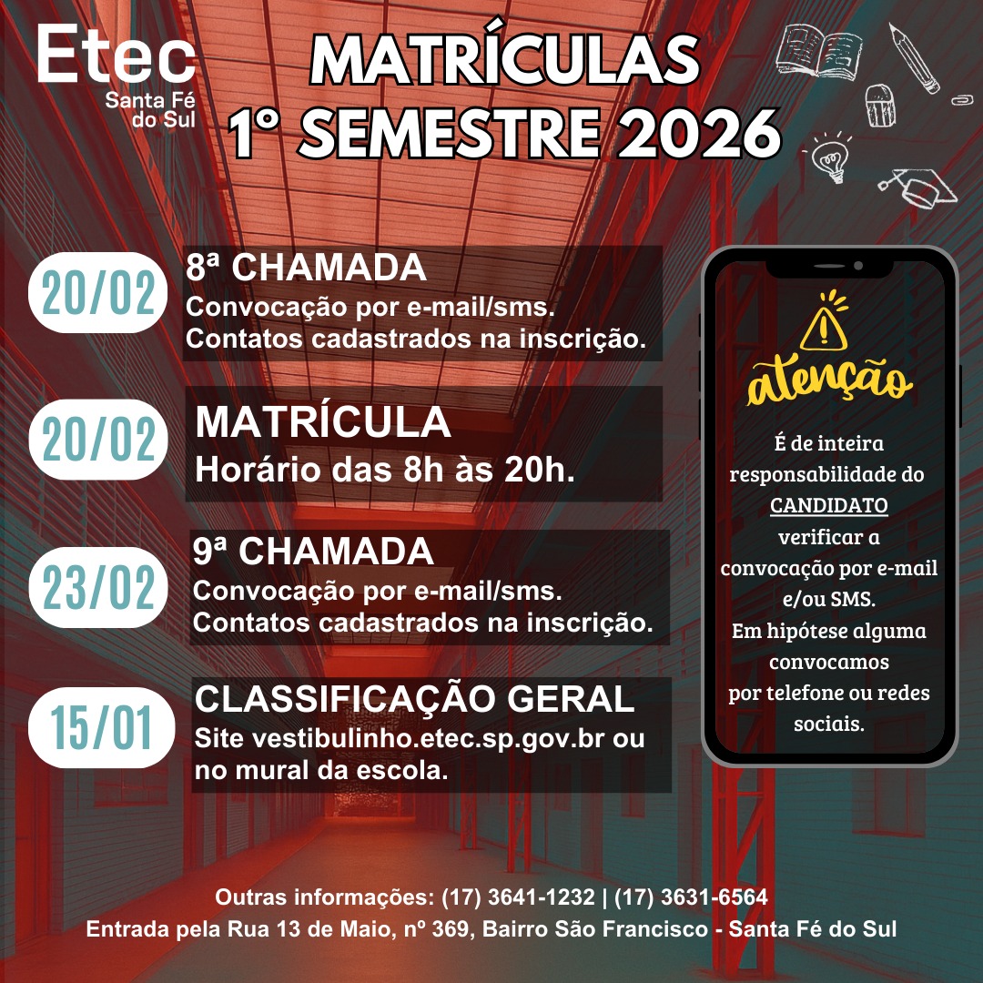 Já estão disponíveis as listas de convocação da 8ª chamada do Vestibulinho 2026. As matrículas deverão ser realizadas no dia 20/02 LISTA: MÉDIO – ADMINISTRAÇÃO – 8ª CHAMADA GERAL