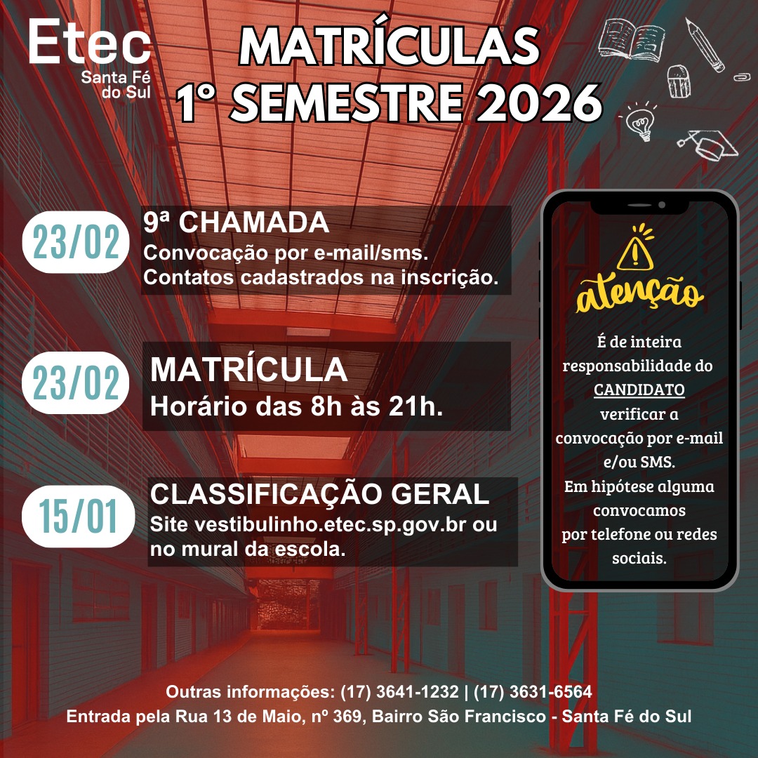 Já estão disponíveis as listas de convocação da 9ª chamada do Vestibulinho 2026. As matrículas deverão ser realizadas no dia 23/02 LISTA: MÉDIO – ADMINISTRAÇÃO – 9ª CHAMADA GERAL